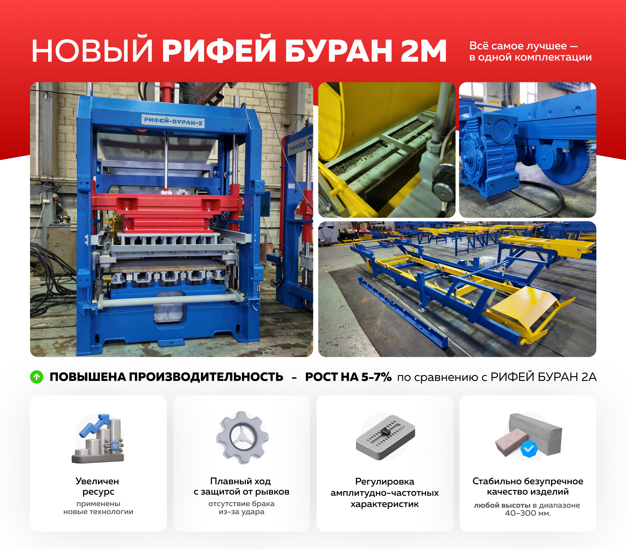 В конце 2025 году мы не просто обновили легендарный станок — мы переосмыслили его работу. Представляем Рифей Буран 2М это новая комплектация вибропресса с улучшенными показателями по производительности, удобству эксплуатации и повышению ресурса.